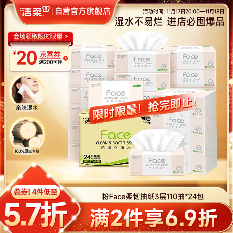 洁柔抽纸 粉Face柔韧3层110抽*24包 可湿水纸巾卫生纸 抽纸整箱