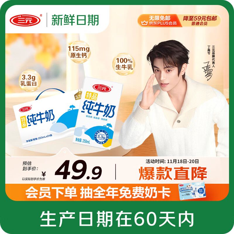 三元【新鲜日期】特品纯牛奶250ml*24盒 100%生牛乳