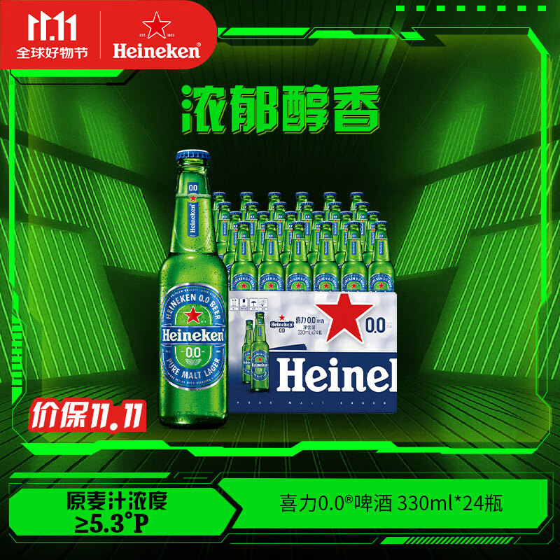 喜力0.0啤酒330ml*24瓶 喜力啤酒Heineken 原装进口 苏超啤酒