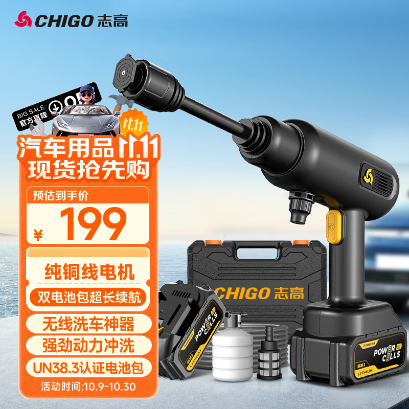 志高(CHIGO)无线锂电洗车机高压水枪家用庭院多功能清洗神器双电池抖音同款