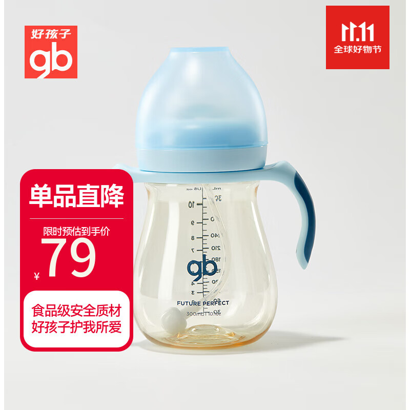 好孩子(gb)PPSU婴儿奶瓶宽口径奶瓶带手柄吸管小饿魔系列300ml蓝色 6个月+