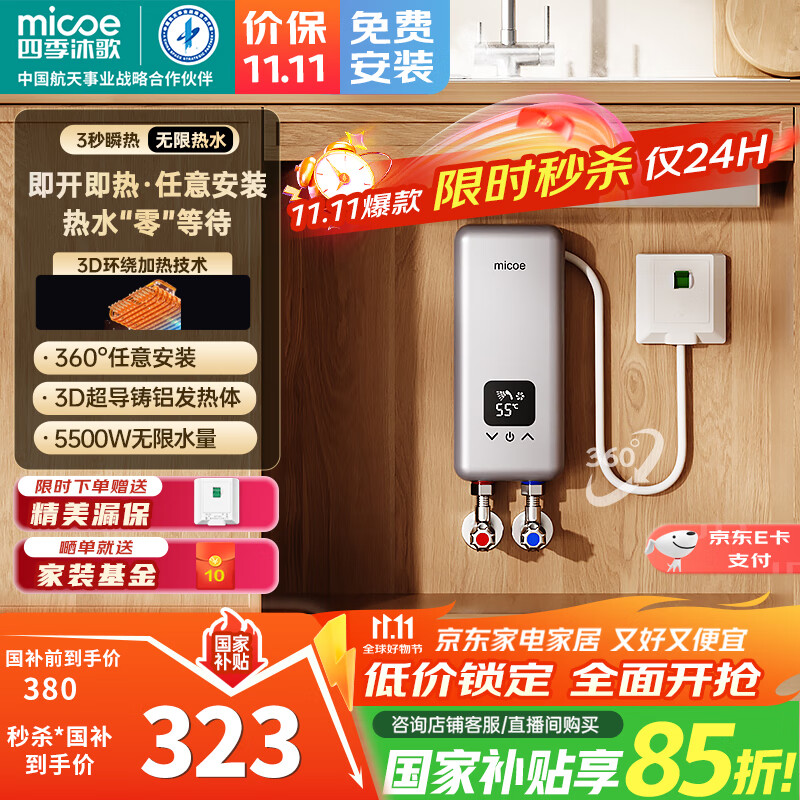 四季沐歌(MICOE)即热式小厨宝三档变频电热水器不限水量5500W厨房热水宝过水热水电分离上门安装
