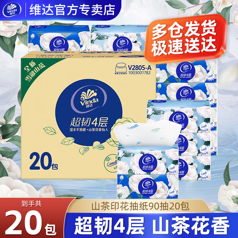 维达山茶花香抽纸 超韧4层90抽面巾纸餐巾纸卫生纸家用实惠整箱装 4层 90抽*20包 【整箱装】