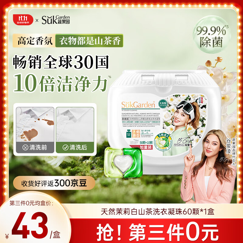 蔬果园茉莉白山茶洗衣凝珠10g*60颗三腔浓缩洗衣液除菌除螨 柔顺留香