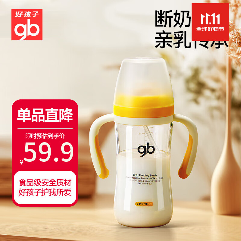 好孩子(gb)婴儿防胀气防呛奶玻璃奶瓶新生儿奶瓶吸管重力球学饮杯260ML-浅黄