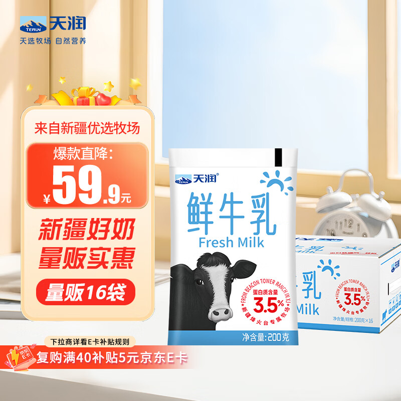 天润 新疆产地 鲜牛乳 3.5g蛋白 巴氏杀菌鲜牛奶 200g*16袋