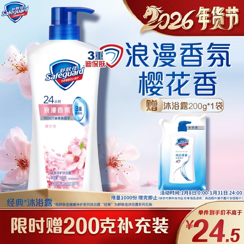 舒肤佳健康净护沐浴露樱花香550g 留香沐浴乳液男女士通用新旧包装随机