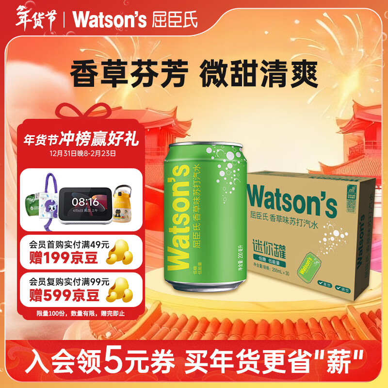 屈臣氏(Watsons)苏打汽水香草味mini罐迷你低糖0脂低卡气泡饮料200ml*30罐便携装