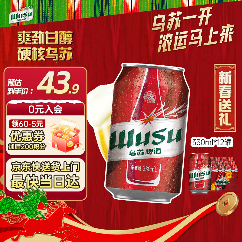 乌苏啤酒(wusu)京东自营新春送礼大红乌苏烈性啤酒330ml*12罐/箱整箱装婚宴