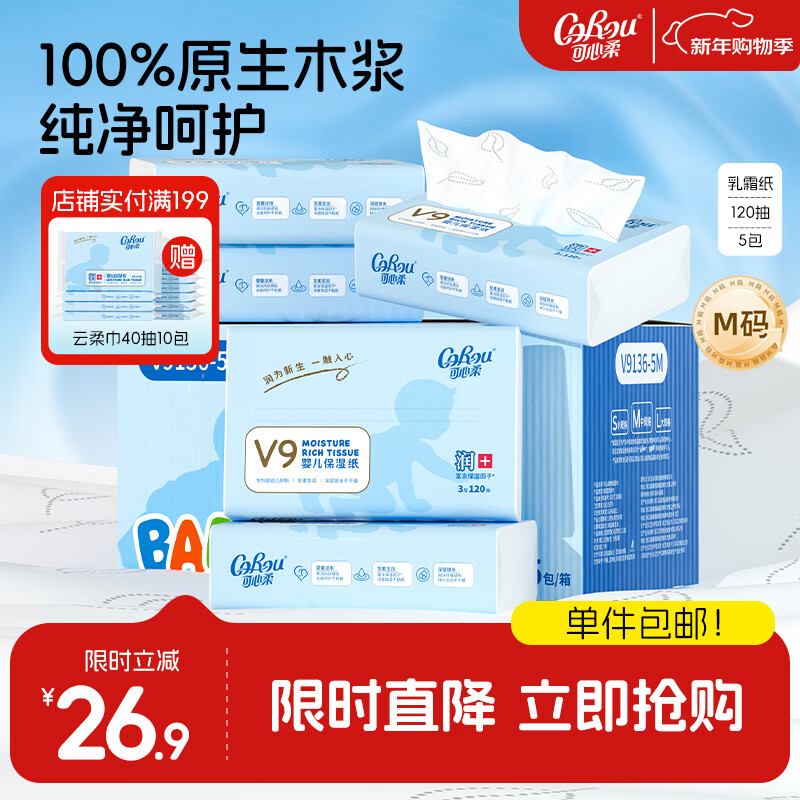 可心柔(COROU)V9婴儿纸巾3层M码120抽乳霜纸母婴宝宝云柔巾卫生纸抽纸 【保湿柔润】 3层 120抽*5包 M码