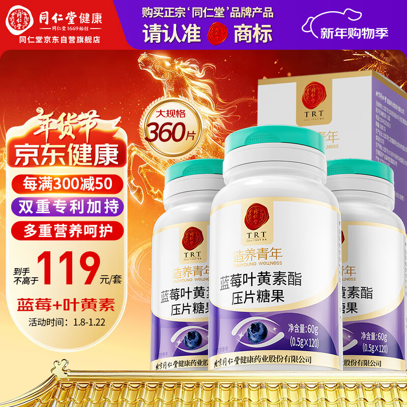 同仁堂蓝莓叶黄素120片*3瓶叶黄素酯学生成人青少年中老年眼睛呵护