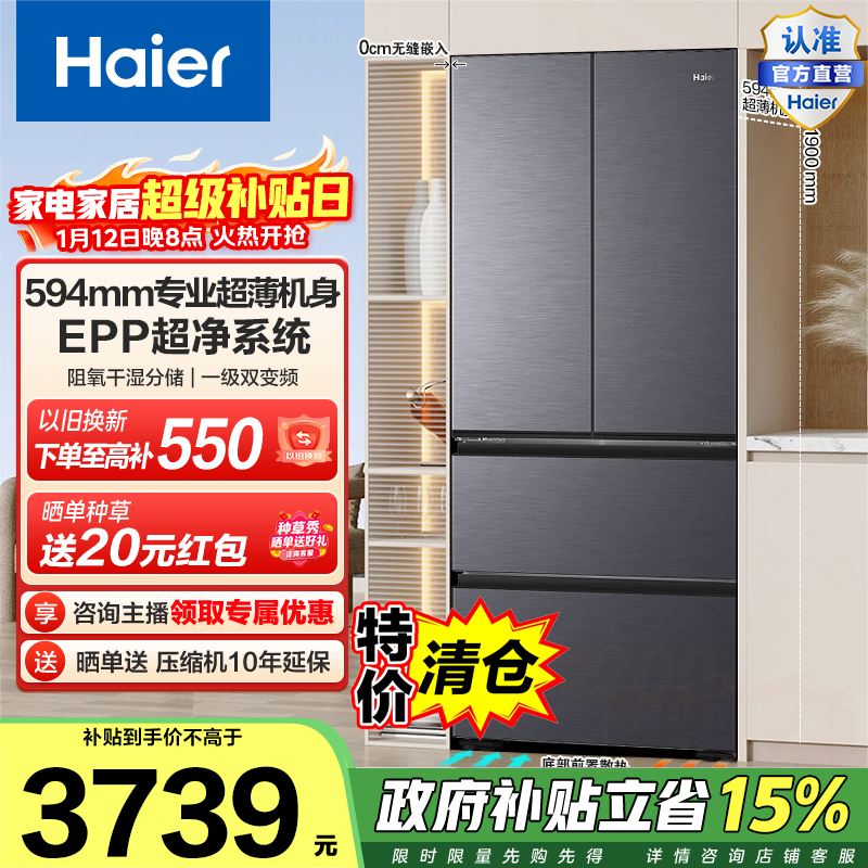海尔(Haier)小红花482升法式多门冰箱594超薄零嵌EPP超净阻氧干湿分储BCD-482WGHFDB9SYU1政府补贴15% 482L法式|超薄零嵌|EPP超净