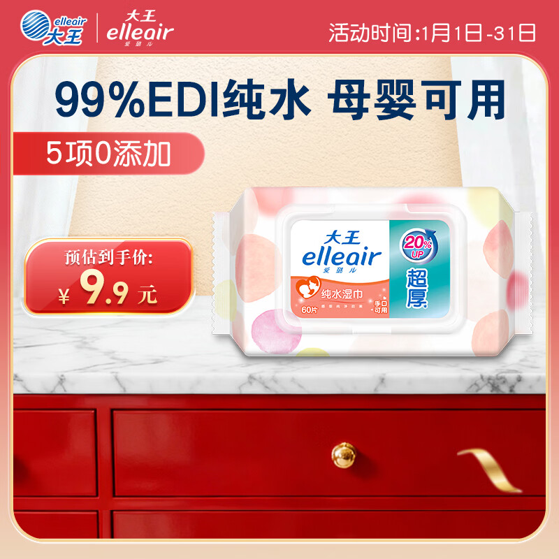elleair马卡龙EDI纯水湿巾婴儿手口湿巾宠物清洁湿巾加厚无酒精60抽