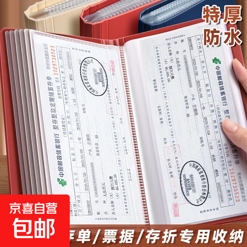 资料册定期存单收纳本多功能票据存单夹银行大额纸质存单卡一体包防水大容量收集存款存折活页 pp搭扣款-酒红色-可放40张存单+24张卡
