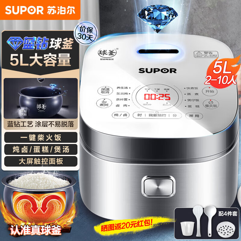 苏泊尔(SUPOR) 电饭煲电饭锅微压5L大容量4-5-10人电饭锅家用多功能一体蓝钻球釜柴火饭智能预约多功能煮饭锅 升级特色炖卤+快煮饭 5L