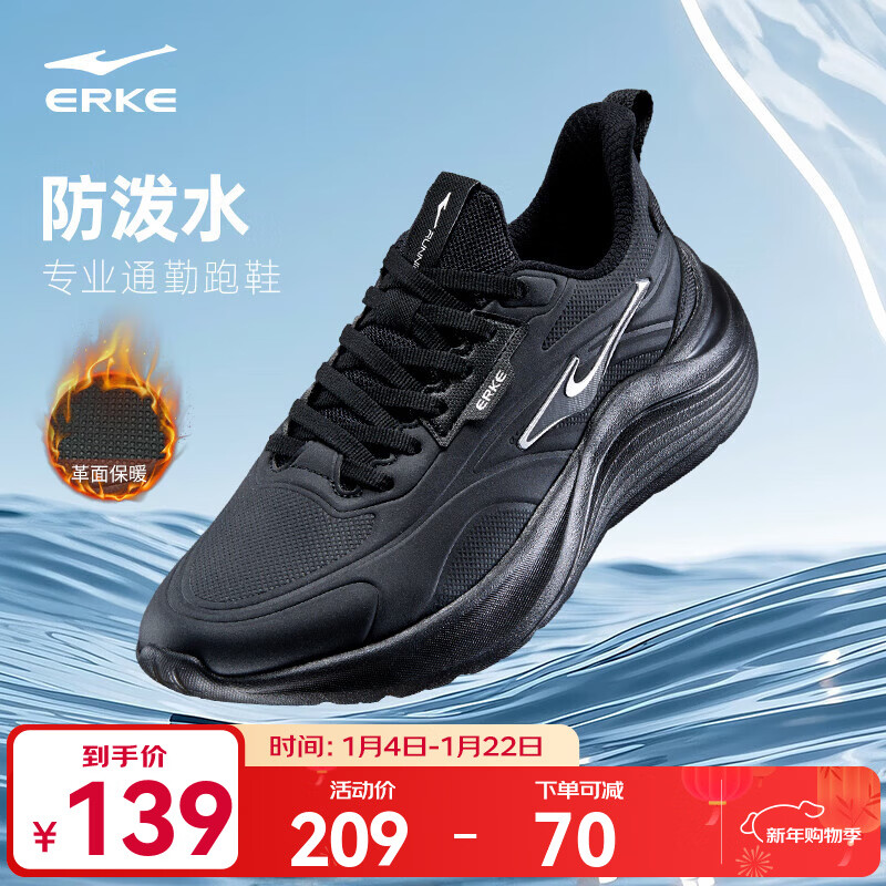 鸿星尔克男鞋秋冬季新款防泼水革面跑鞋黑色轻便跑步鞋保暖运动鞋子男款 正黑 【革面款】 42