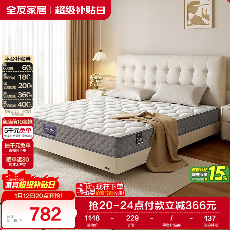 全友家居 床垫护脊椰丝绵软硬适中席梦思床垫子1.8米弹簧床垫政府补贴