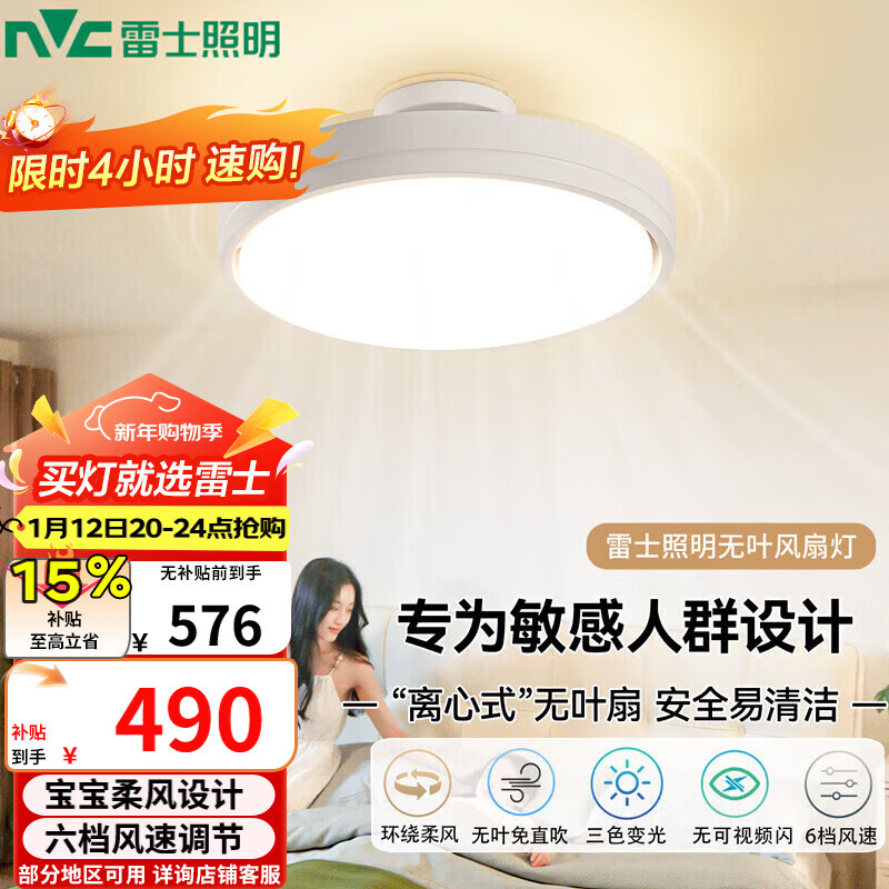 雷士(NVC)LED照明无叶风扇灯隐形吊扇客厅卧室餐厅儿童房39瓦宝宝柔光柔风