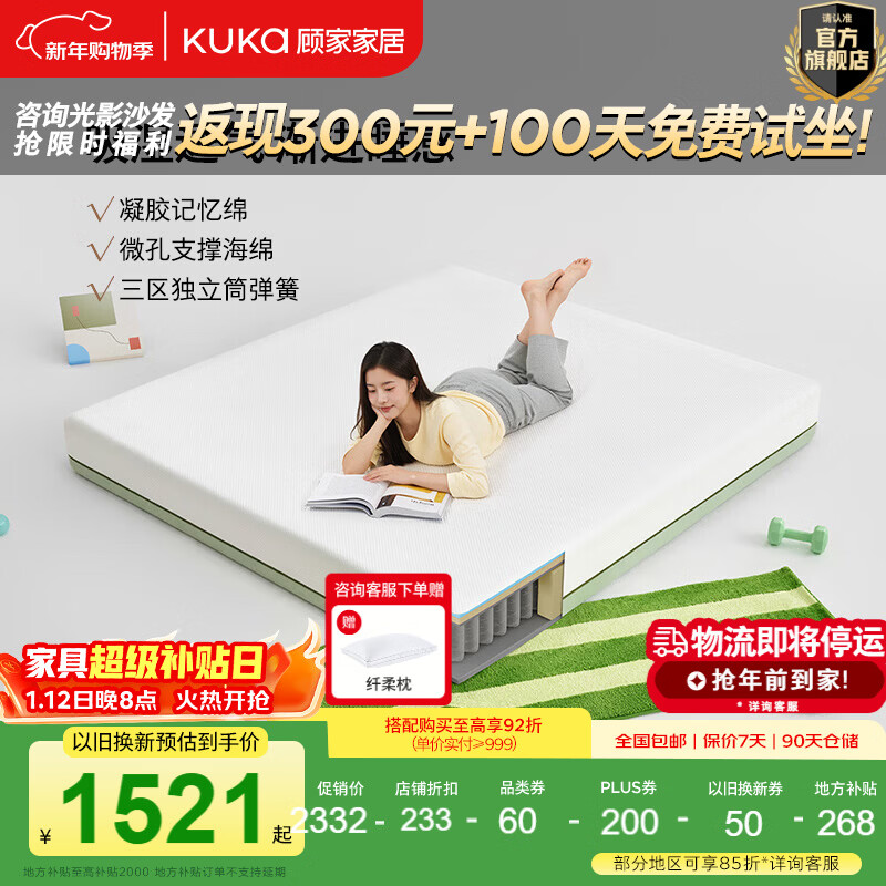顾家家居【透气呼呼系列】记忆棉床垫静音舒睡吸湿排汗高支撑床垫M5030 【经典版】牛油果绿 1.8*2.0m【主推】