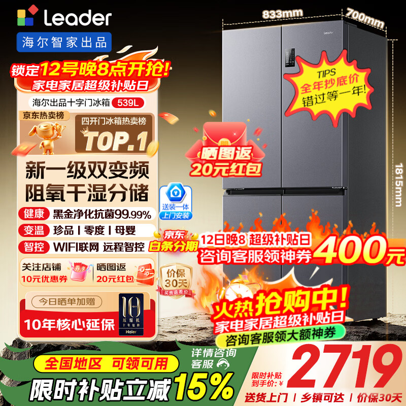 海尔(Haier)冰箱出品统帅560四开门十字对开门双开539升大容量风冷无霜新一级能效变频Leader电冰箱 家电补贴 【海晶灰539升】大容量囤货+干湿分储+黑金净化