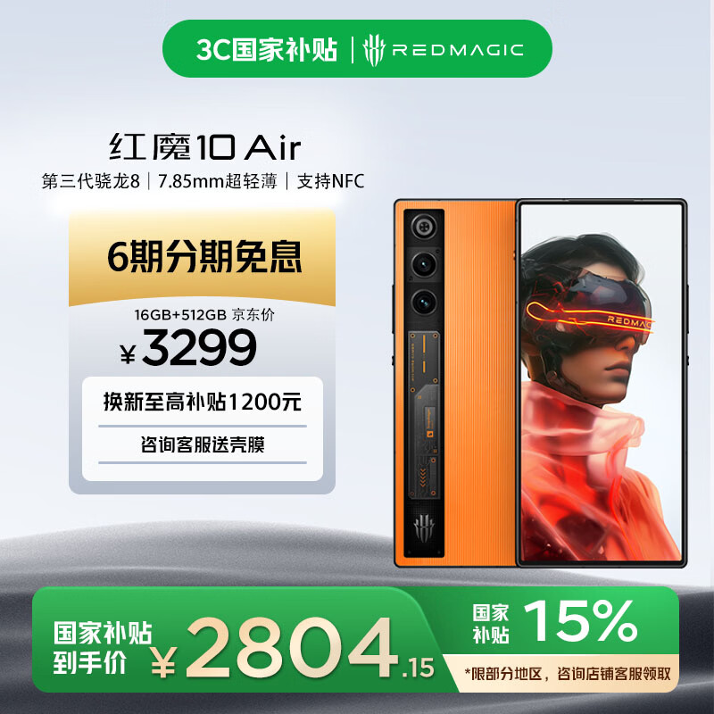 努比亚(nubia)红魔10 Air 16GB+512GB 烈焰橙 7.85mm轻薄设计 6000mAh 游戏手机 电竞肩键 支持NFC红外功能