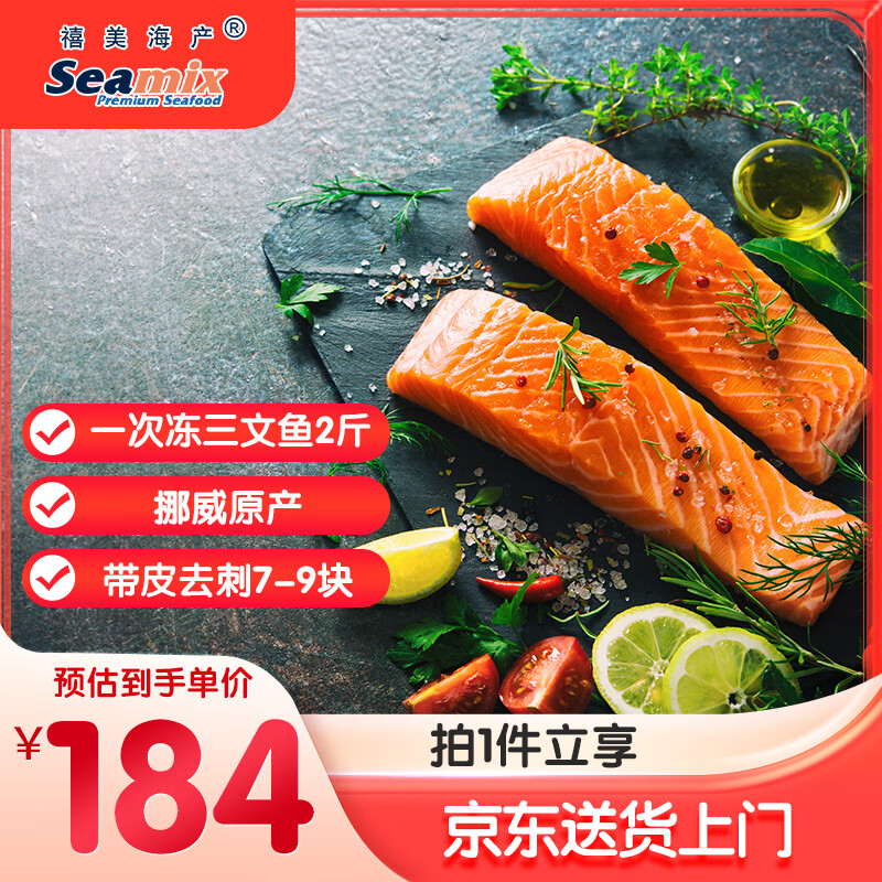 禧美海产 挪威原产一次冻大西洋三文鱼 净重2斤 去刺7-9块独立装 海鲜水产