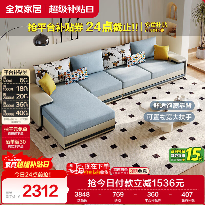 全友家居现代简约家用大户型贵妃转角沙发客厅实木架布艺沙发政府补贴