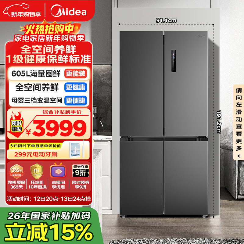 美的(Midea)605L十字门冰箱超大容量全空间养鲜抗菌净味一级能效风冷无霜双变频以旧换新MR-635WSPZE国家补贴
