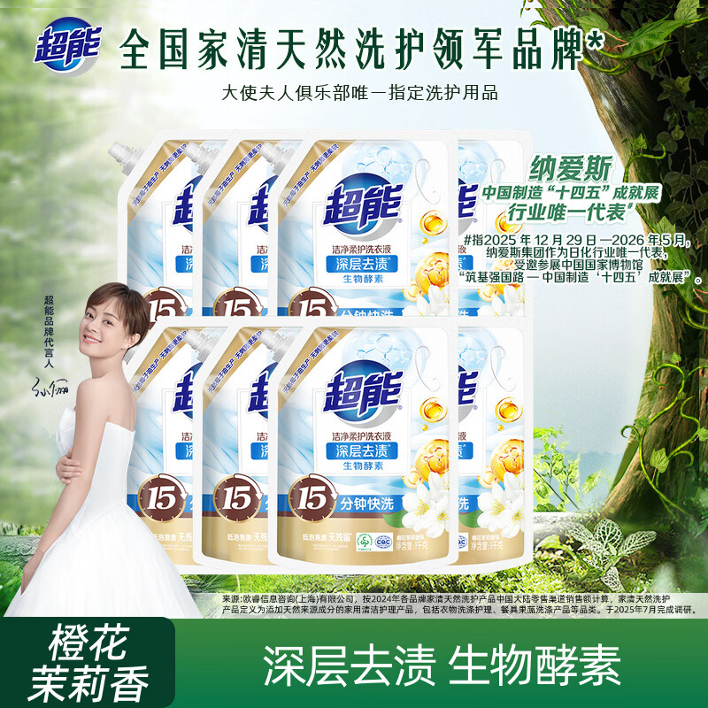 超能 洁净柔护洗衣液 橙花茉莉香 16斤整箱(1kg*8袋) 15分钟快洗