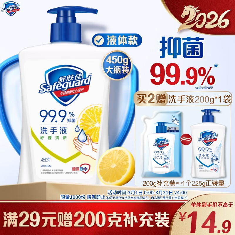 舒肤佳抑菌洗手液 柠檬清新450g 健康抑菌99.9% 温和 新旧包装随机