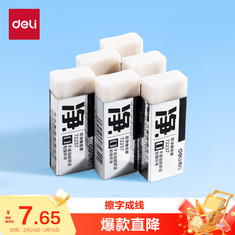 得力(deli)6块中号超洁净橡皮擦 一擦即净 高光美术绘图橡皮开学文具易擦少屑 中考高考学生考试 72257/VP537