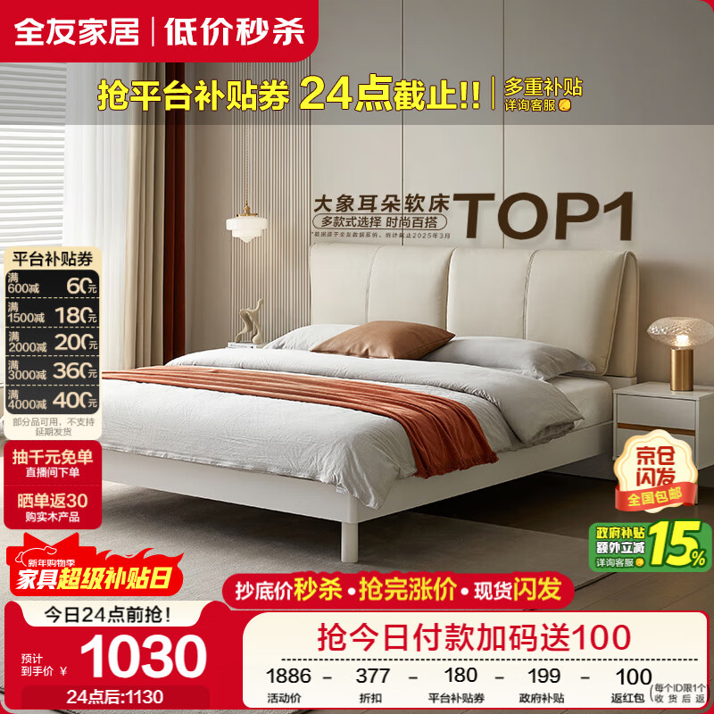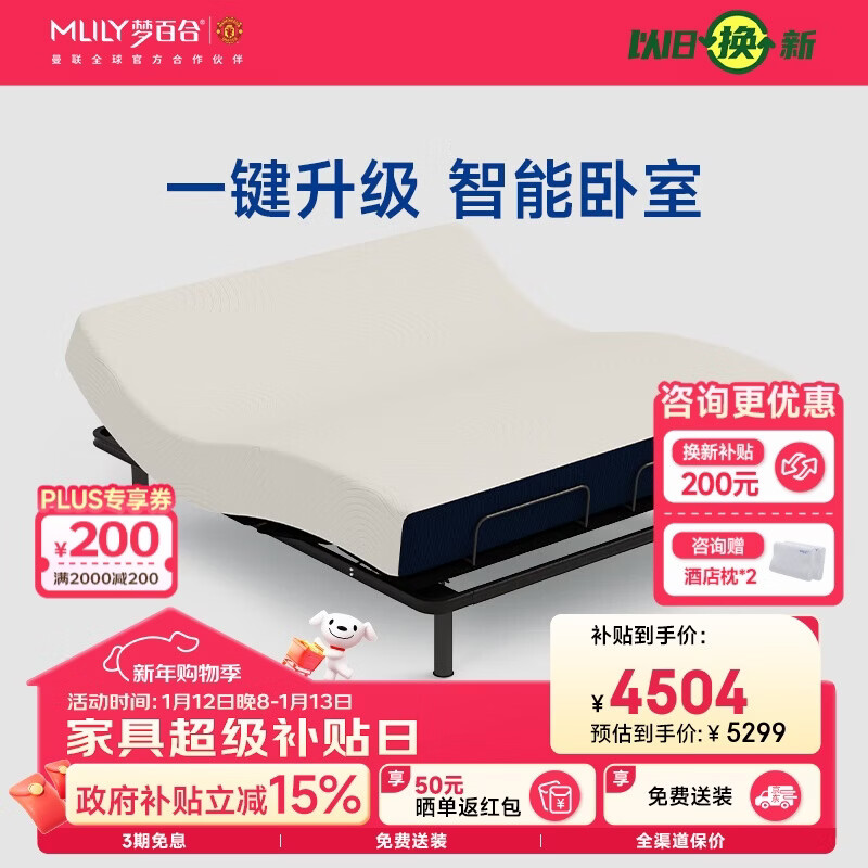 梦百合国民家居联名款智能床 可升降电动床无床头【M1+快充s】1.8米*2米