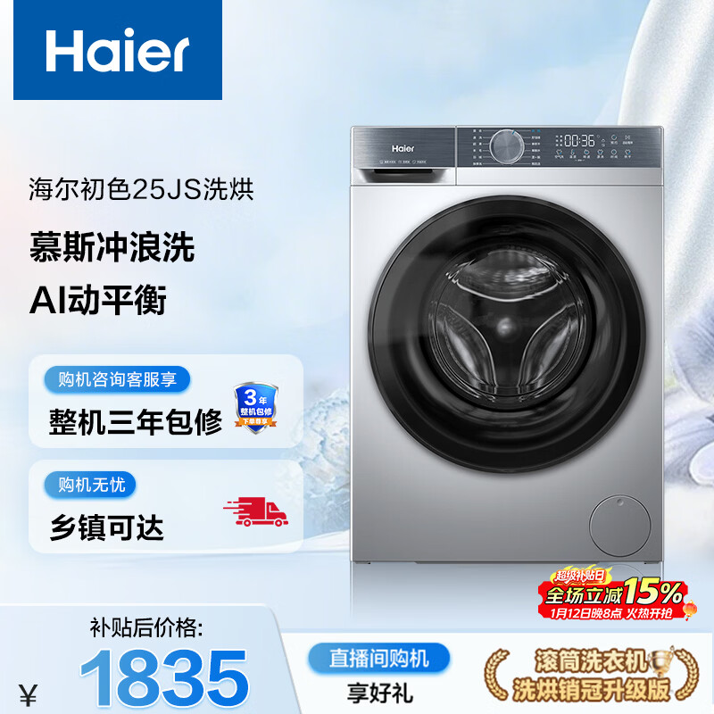 海尔(Haier)初色 全自动滚筒洗烘一体 洗衣机带烘干一体 10KG 超薄 家电国家补贴京东自营 XQG100-H25JS