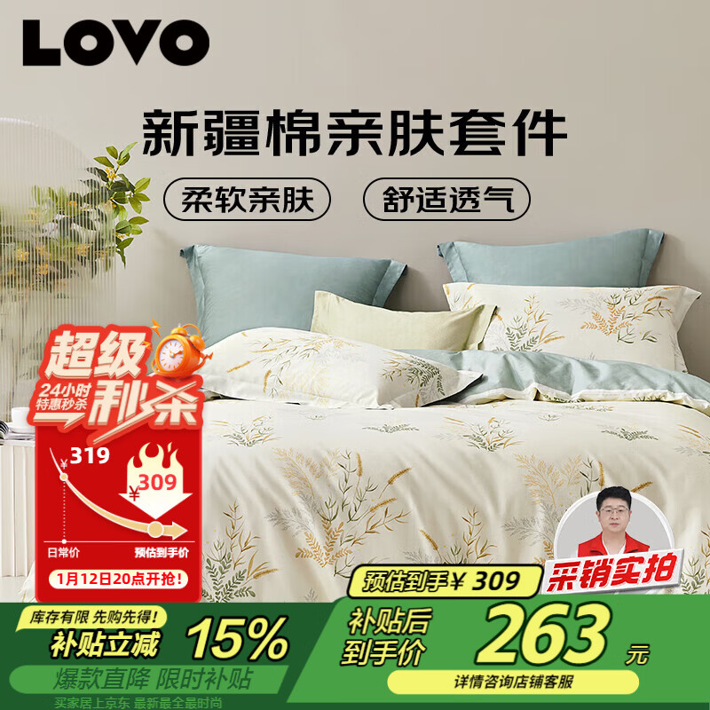 LOVO罗莱家纺 全棉四件套纯棉床单被套双人床品1.8米 京东定制款