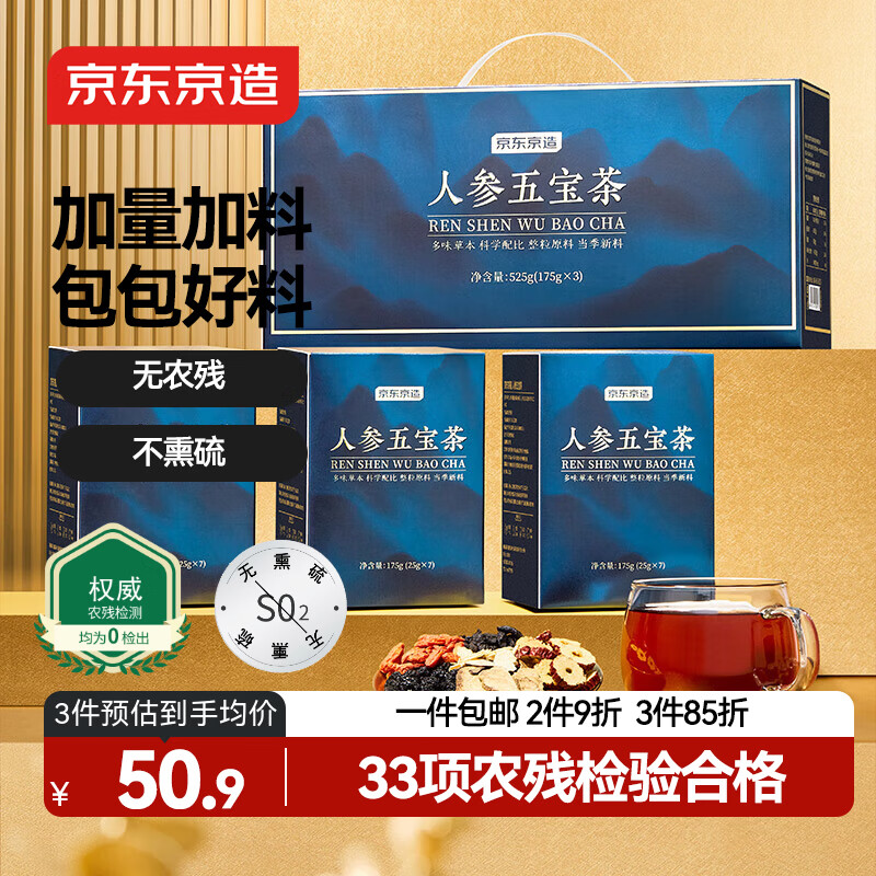 京东京造人参五宝茶525克 礼盒 整料黄精玛咖男性能量枸杞人参茶