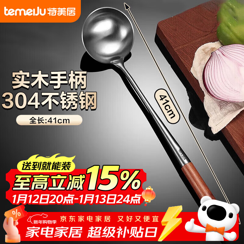 特美居304不锈钢汤勺大号炒菜勺子锅勺加长41cm木柄家用炒菜勺子厨师勺
