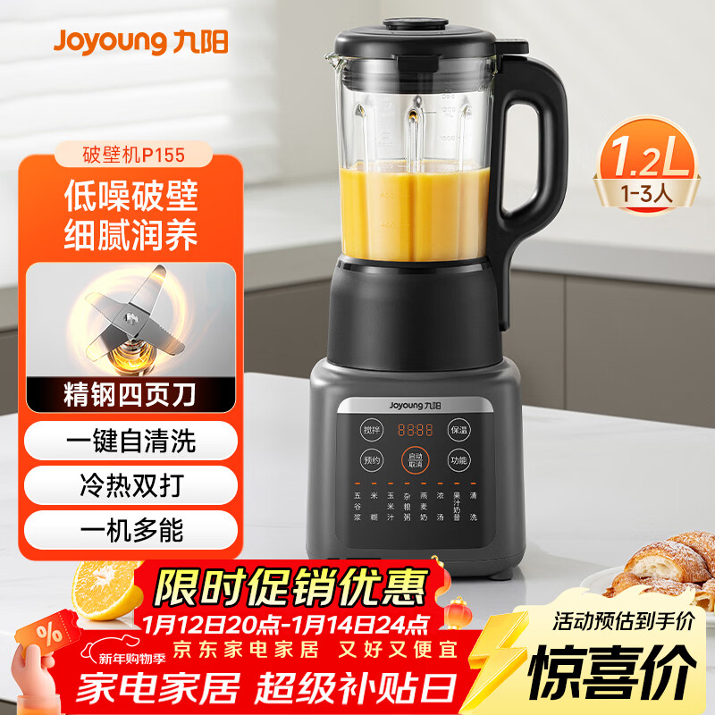 九阳家用豆浆机轻音全自动多功能加热破壁机豆浆机榨汁机辅食机纤薄精巧1.2L容量2-3人用P155