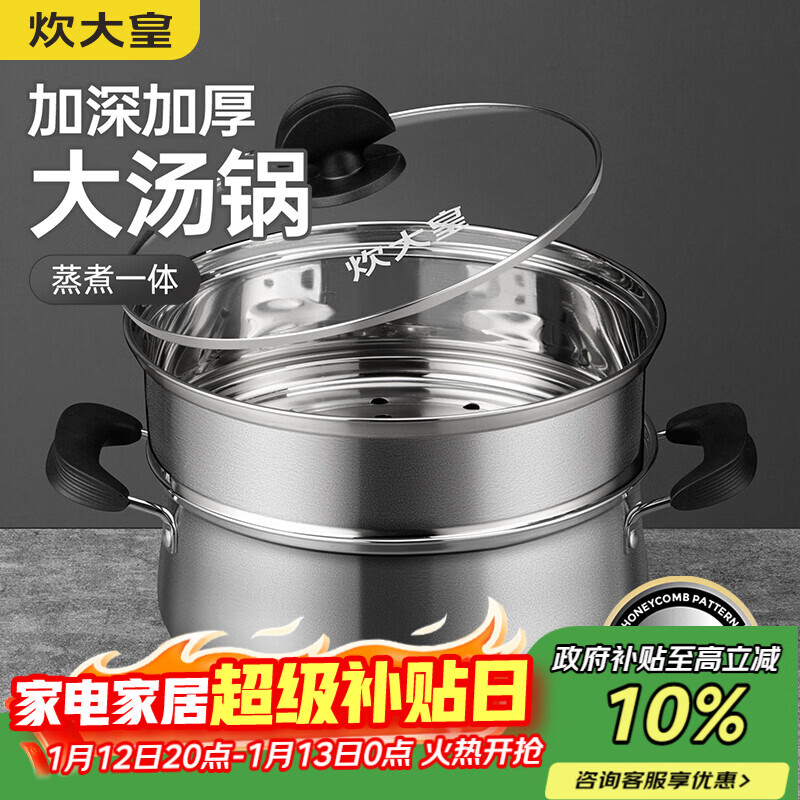 炊大皇304不锈钢汤锅+蒸屉 汤蒸炖锅蒸锅双耳煮粥煮面 22cm 电磁炉通用