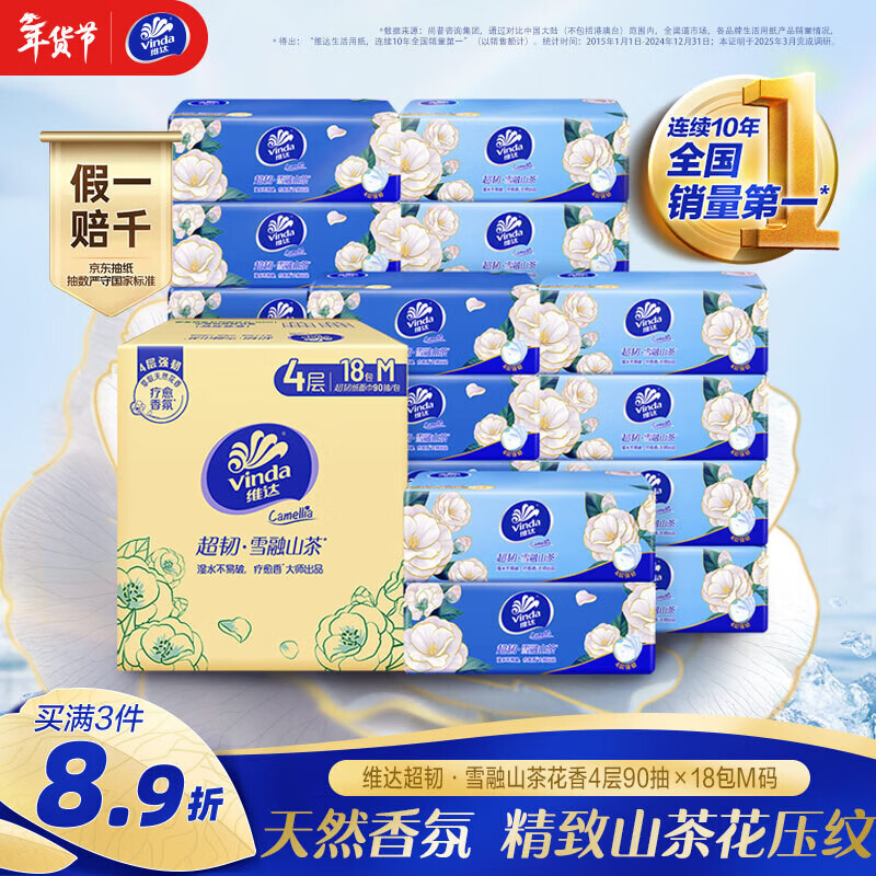 维达(Vinda)抽纸 超韧4层90抽*18包M码 雪融山茶花香 纸巾卫生纸餐巾纸整箱