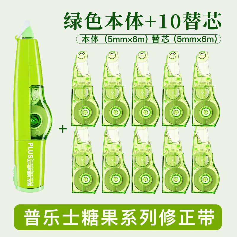 普乐士(PLUS)MR修正带66M大容量学生用涂改带可换替芯改正带智能滚轮WH-635 绿色1本体10替芯 【全网低价】