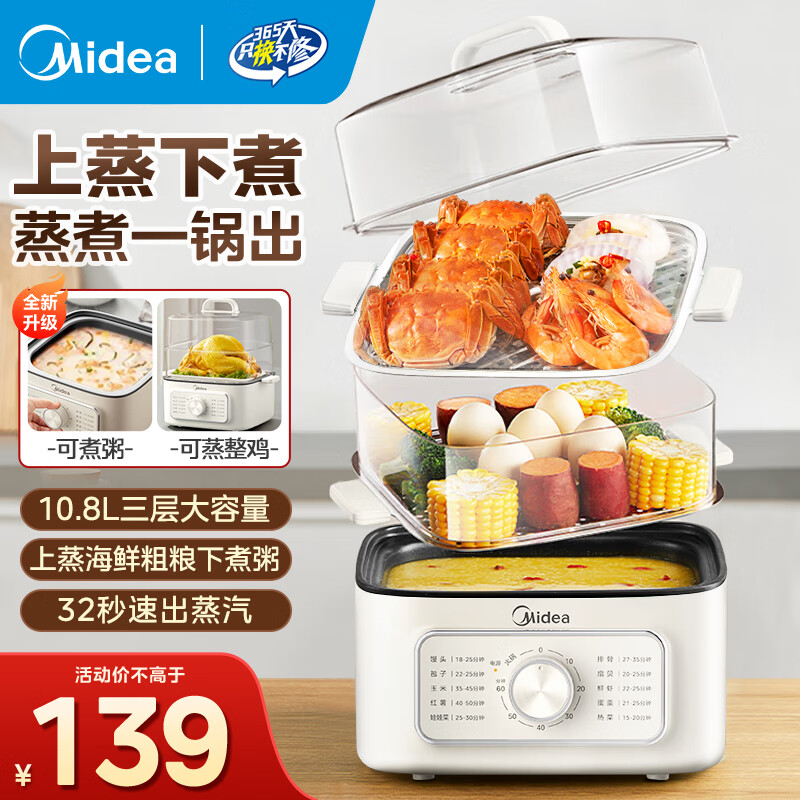 美的(Midea) 电蒸锅 炖蒸煮一体 电蒸箱家用双层三层多功能大容量 全自动不锈钢蒸锅 上蒸下煮 10.8L 【双层上蒸下煮】ZGE2323Z02