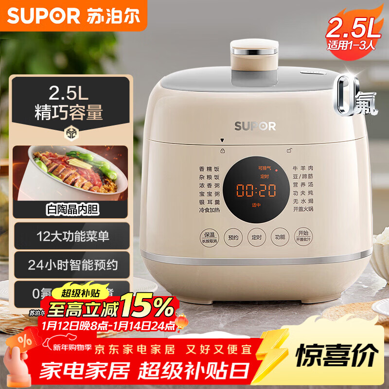 苏泊尔(SUPOR)一人食迷你电压力锅2.5L 开盖火锅家用智能宝宝粥SY-25FC8027电饭煲高压锅1-3人