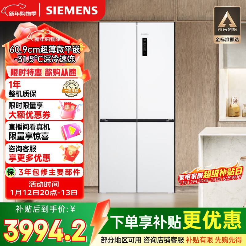 西门子(SIEMENS)无界十字星497L十字门冰箱超薄微平嵌 抑菌清新 一级能效 KC502080EC 国家补贴