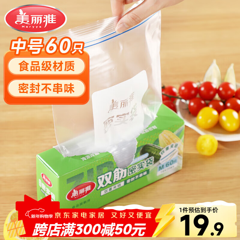 美丽雅密封袋食品级保鲜袋中号60只 加厚冰箱分装收纳密实自封袋