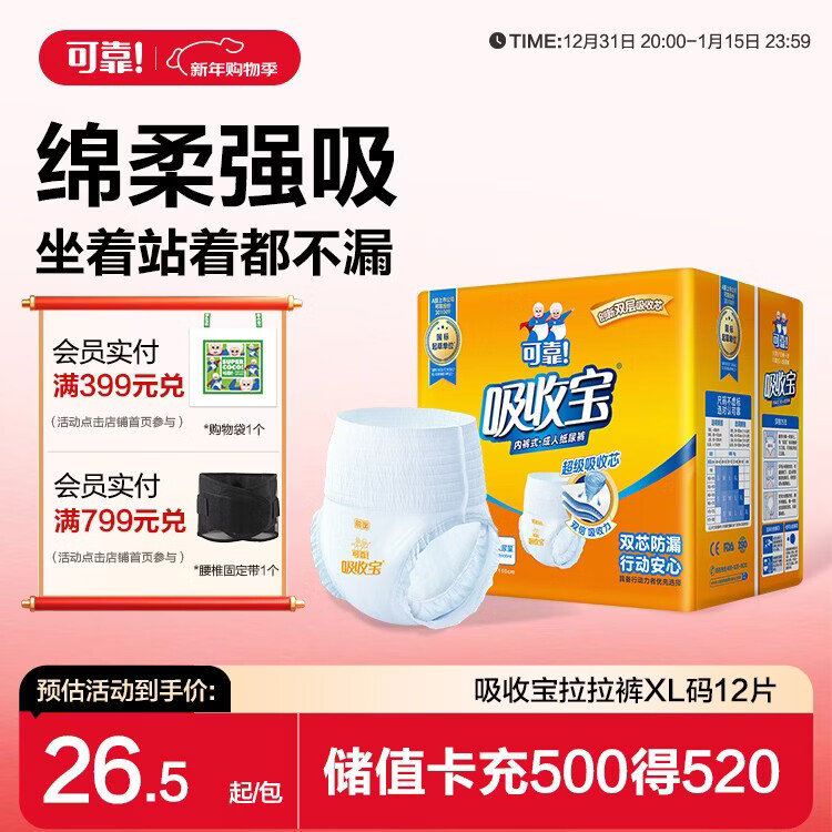 可靠(COCO)吸收宝成人拉拉裤XL12片(臀围≥110cm) 内裤型纸尿裤尿不湿