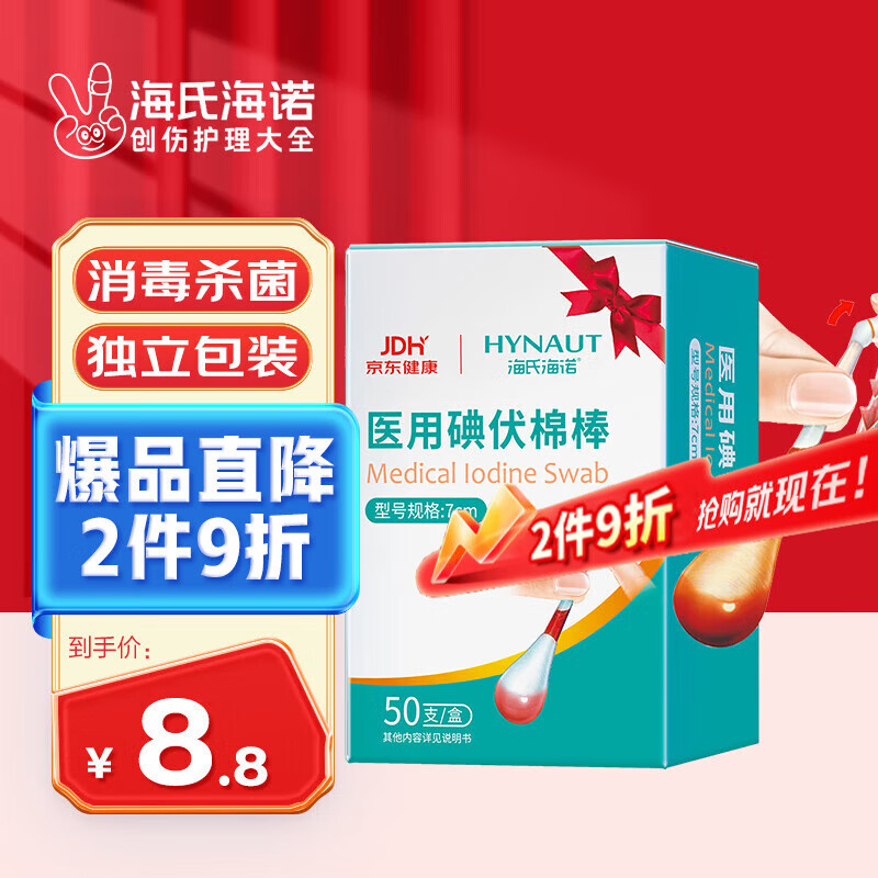 海氏海诺医用碘伏消毒液棉棒50支碘伏棉棒新生婴儿消毒碘酒不含酒精独立装