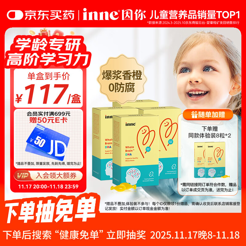 Inne因你全脑dha婴幼儿藻油儿童dha婴儿学生软胶囊40粒*4盒+8粒*2盒
