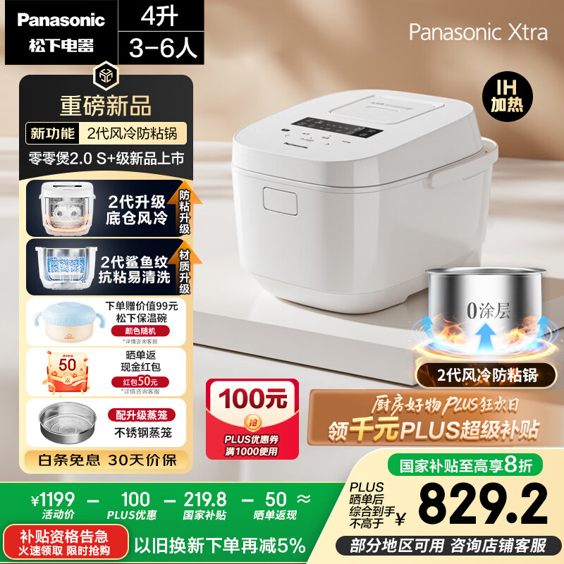松下(Panasonic)【国家补贴20%】Xtra零零煲2.0电饭煲0涂层家用电饭锅4-5人IH无涂层不锈钢4升一级能效SR-HFS155-W