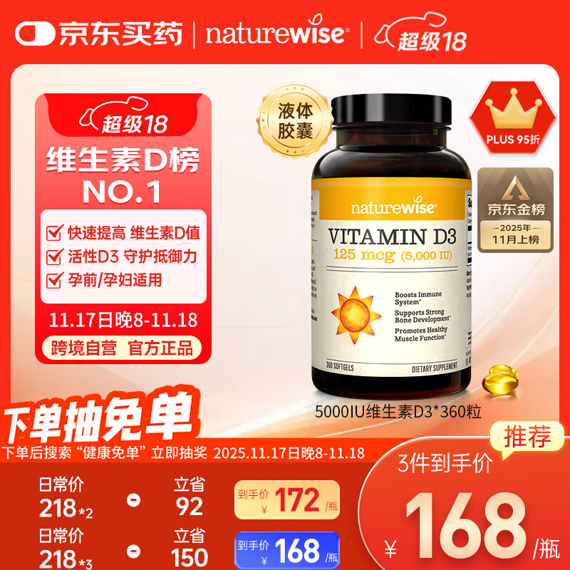 naturewise阳光瓶维生素D3软胶囊5000IU 活性vd3男女备孕成人补钙360粒/瓶