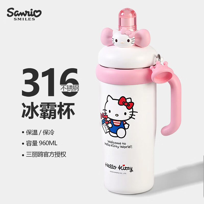 三丽鸥(SANRIO)凯蒂猫HelloKitty啵啵冰霸保温杯316不锈钢带吸管女生日礼物960ml